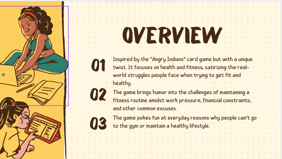 Inspired by the "Angry Indians" card game, this project takes a fresh and humorous spin on the world of health and fitness. While it draws conceptual influence from the original, this card game stands on its own with a unique focus on the often absurd, relatable struggles people face in their journey to get fit.